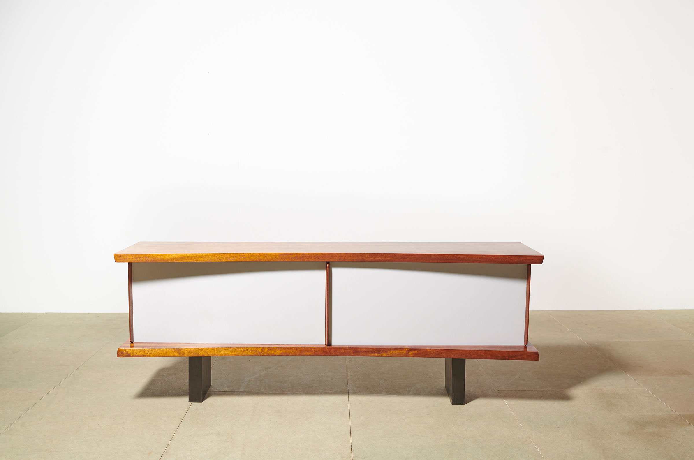 La structure, de forme rectangulaire en acajou, ouvrant en façade par deux portes en formica blanc, reposant sur 2 pieds teintés noir. Des tiroirs noirs et blancs à l’intérieur et des étagères.