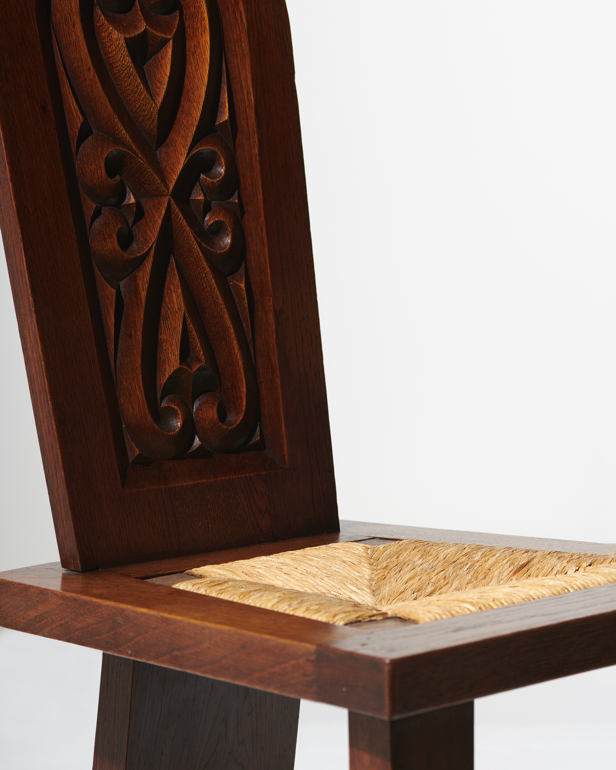 Structure tripode en chêne, assise paillée et dossier arrondi en bois à motif asymétrique