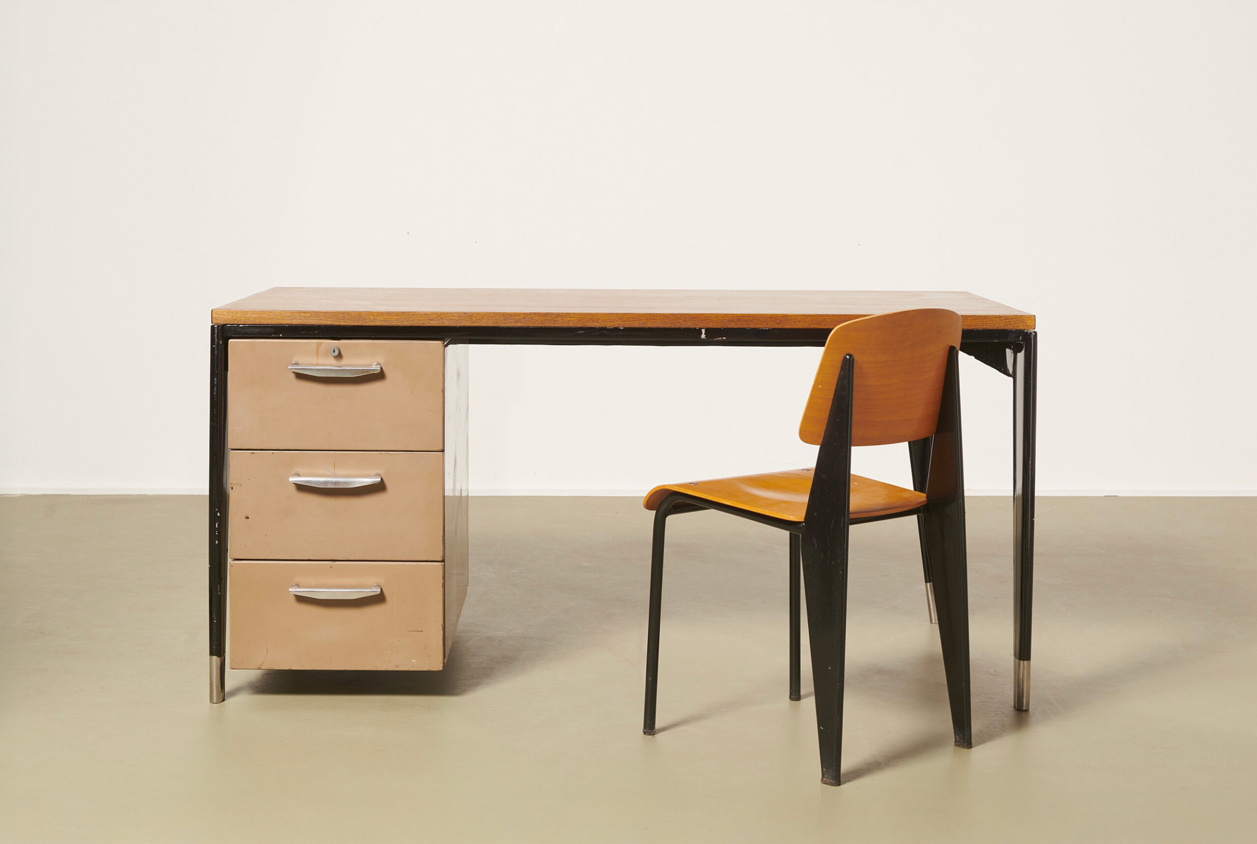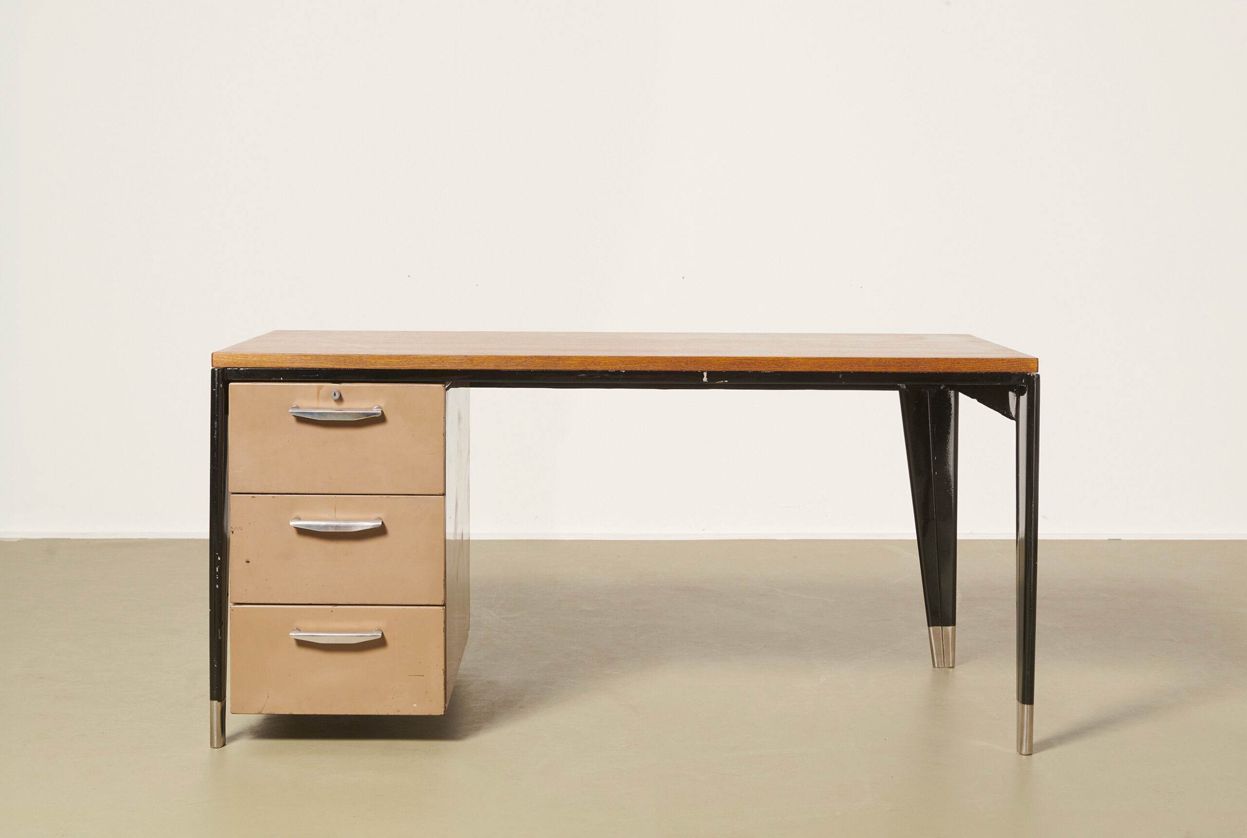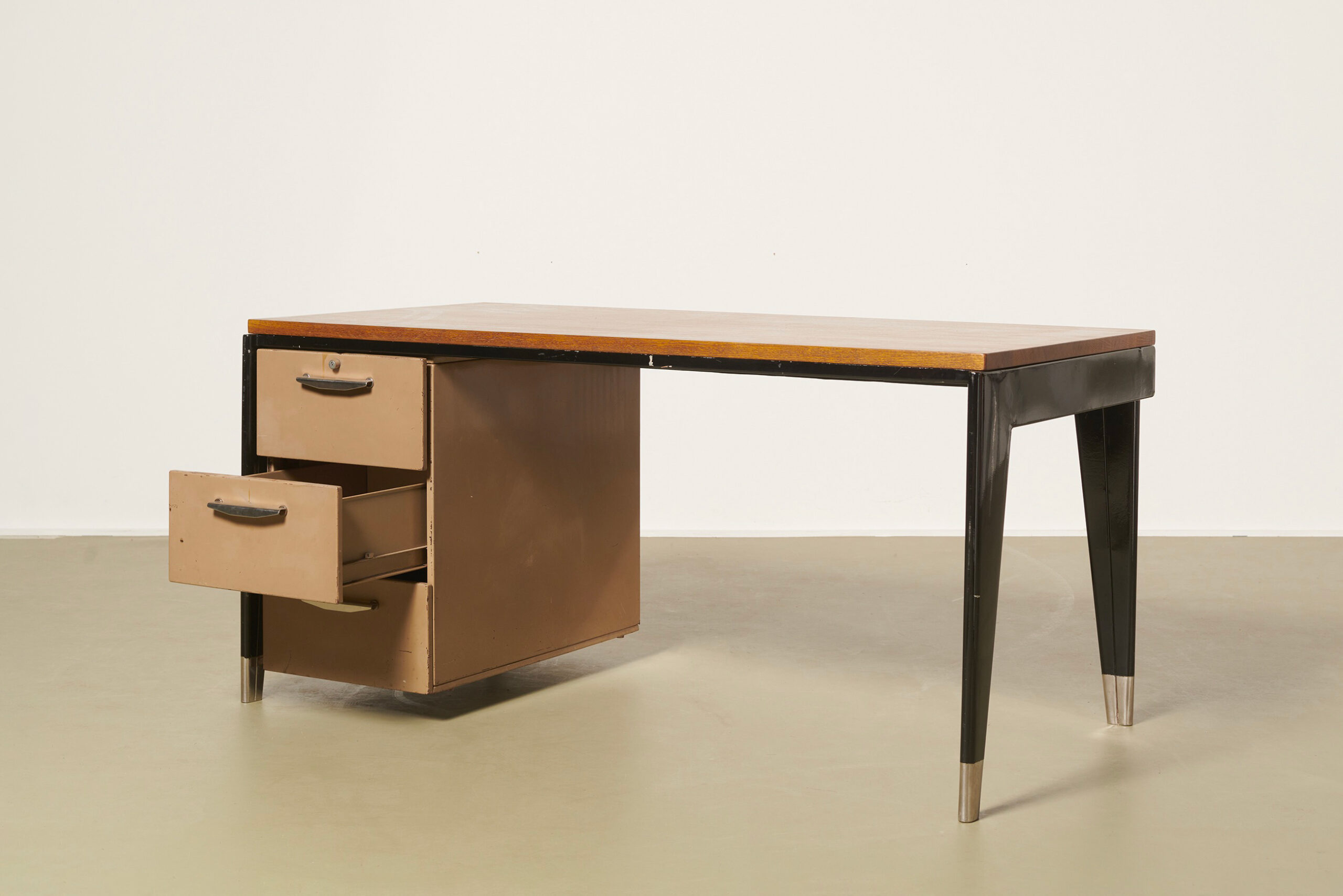 De forme rectangulaire, la structure et le caisson à 3 tiroirs en tôle d’acier pliée laquée beige et noir ; le plateau en chêne.