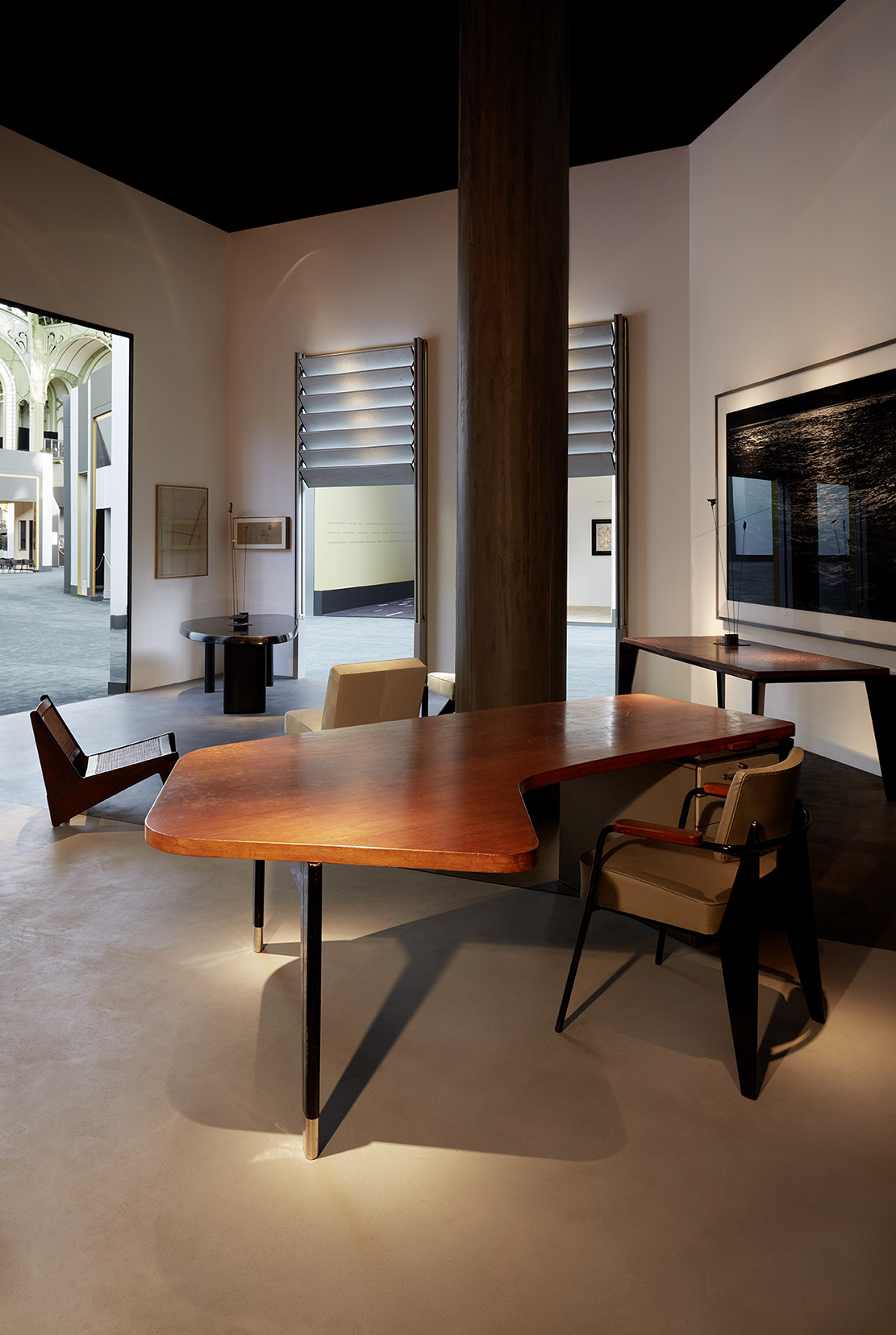 Charlotte Perriand (1903-1999), gure de proue du mobilier des années 50, femme libre et engagée, s’est e orcée de créer un mobilier aux lignes modernes tout en respectant les techniques et les matériaux traditionnels. Parmi les objets d’exception, sera présentée une rare banquette, à structure en acier, créée en 1966 pour la résidence privée de l’ambassadeur du Japon en France. Jean Prouvé (1901-1984), esprit multiple à la fois ingénieur, architecte et constructeur s’est attelé à l’industrialisation du processus de fabrication créant machines et ateliers a n de proposer un mobilier fonctionnel et accessible à tous. Une rare table Granito, une bibliothèque des années 30, un bureau Présidence, ainsi que des éléments d’architectures. Quand à lui Pierre Jeanneret (1896-1967) est toujours resté en retrait auprès de son illustre cousin Le Corbusier. Méconnu du grand public ce créateur, l’un des tout premier à avoir dessiné des modèles pour Knoll International, illustre le caractère familial de cette avant-garde du design, prenant part aux projets des plus grands de ses collaborateurs et amis. L’unique table à cinq pans qu’il conçut pour la salle à manger de la famille Prouvé en 1943, dans une France occupée sera exposée La Galerie présentera également une unique table à jeux, commande spéciale de 1948 ainsi que quelques très rares pièces provenant de la ville de Chandigarh en Inde.